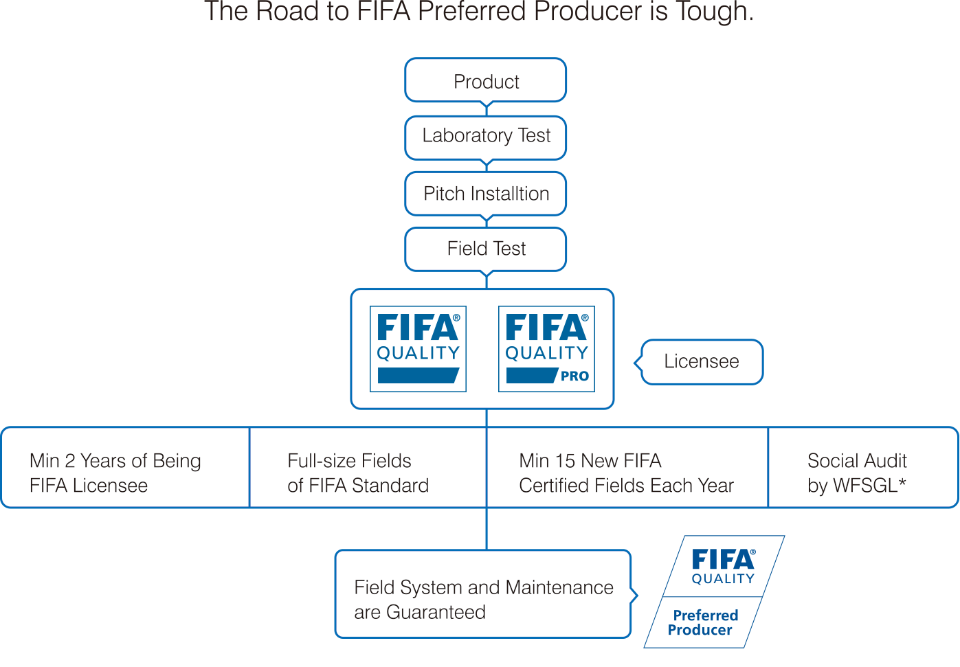 The FIFA Preferred Producer (FPP) initiative was introduced in 2009 in response to demand for higher quality not only in the product itself but also in the installation process of football turf. The overall objective is to protect the interests of consumers when purchasing pitches and to ensure the football turf pitches meet high requirement with regards to quality, performance and safety. To attain the qualification, the manufacturer also has to comply with FIFA’s high standards in terms of: