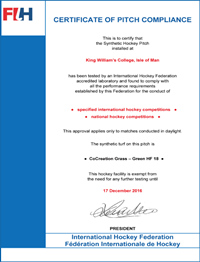 Hockey fields have very strict standards for artificial grass. The grass must meet very specific qualifications for ball rolling, foot sliding, shock absorption and more. CCGrass is an International Hockey Federation (FIH) approved manufacturer. We offer FIH approved Global Level hockey systems and National Level hockey systems to suit your unique needs. Our high level products have also been awarded the FIH field certificate.
